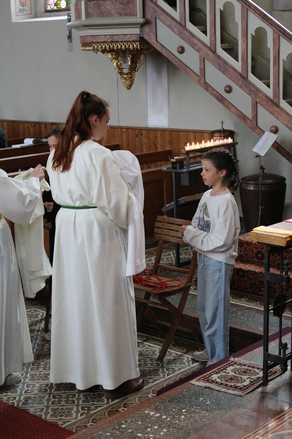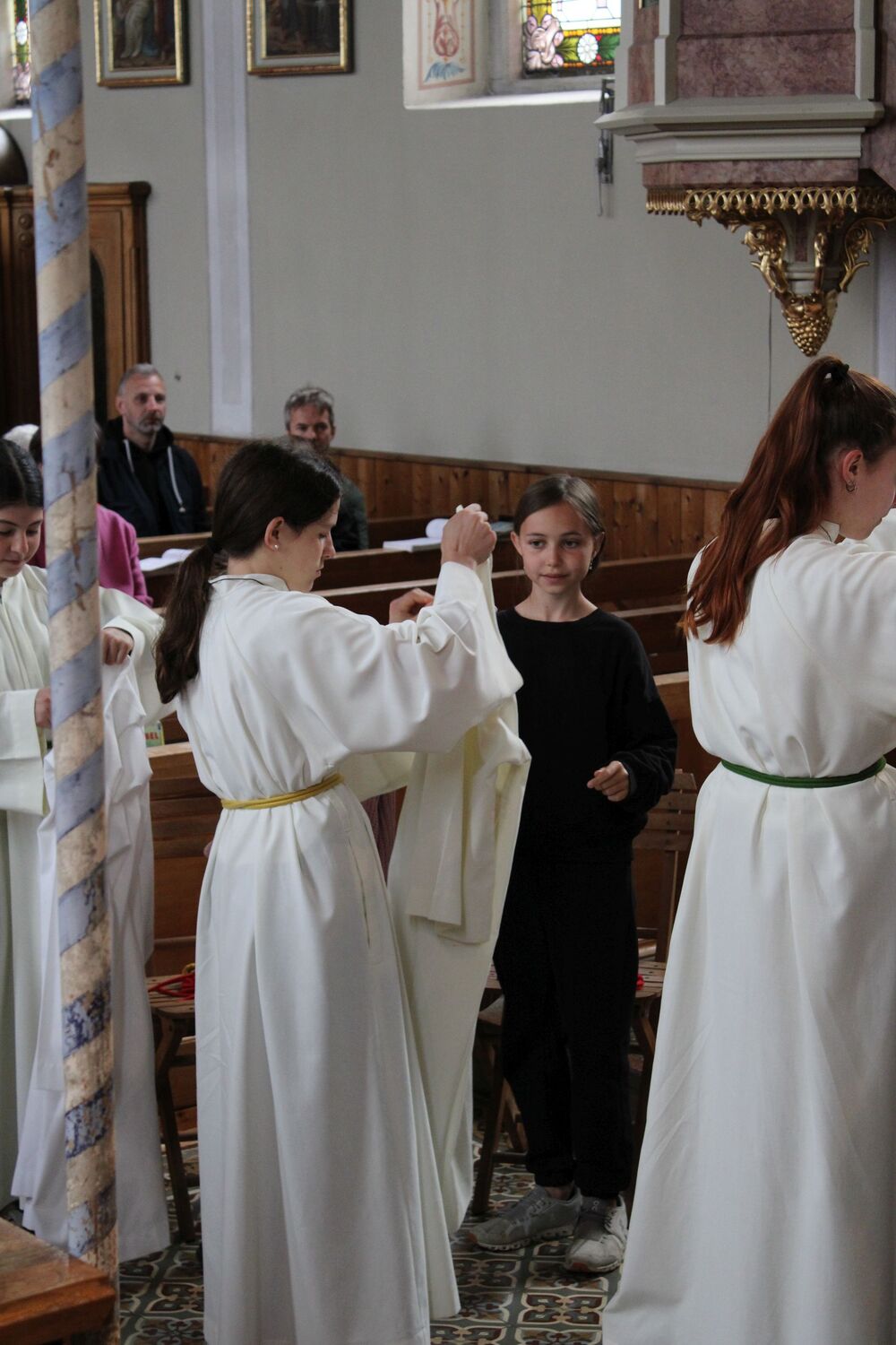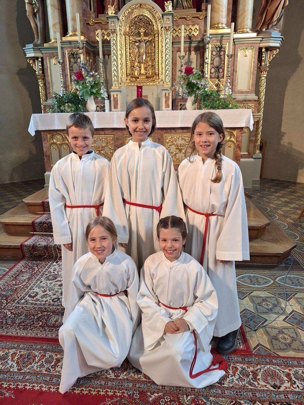 Bevor die neuen Ministranten:innen - Anna Ender, Magdalena Oberhammer, Sara Ambrosig, Theresa Eder und Simon Sinz - ihre Dienste am Altar übernahmen, erklärten sie ihre Bereitschaft. Danach halfen die großen Ministrantinnen beim Anziehen der Ministrantengewänder und Pater Regis segnete die neuen Minis.
