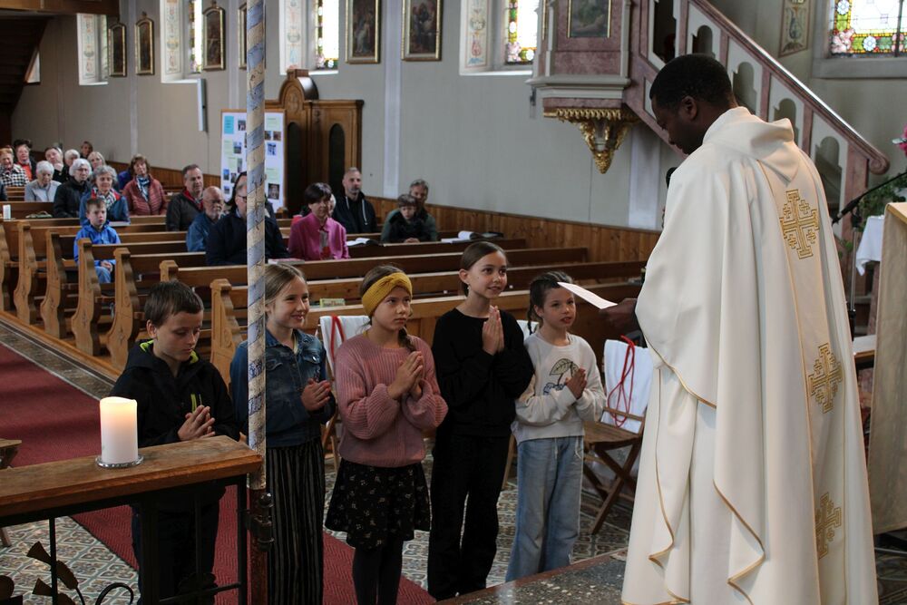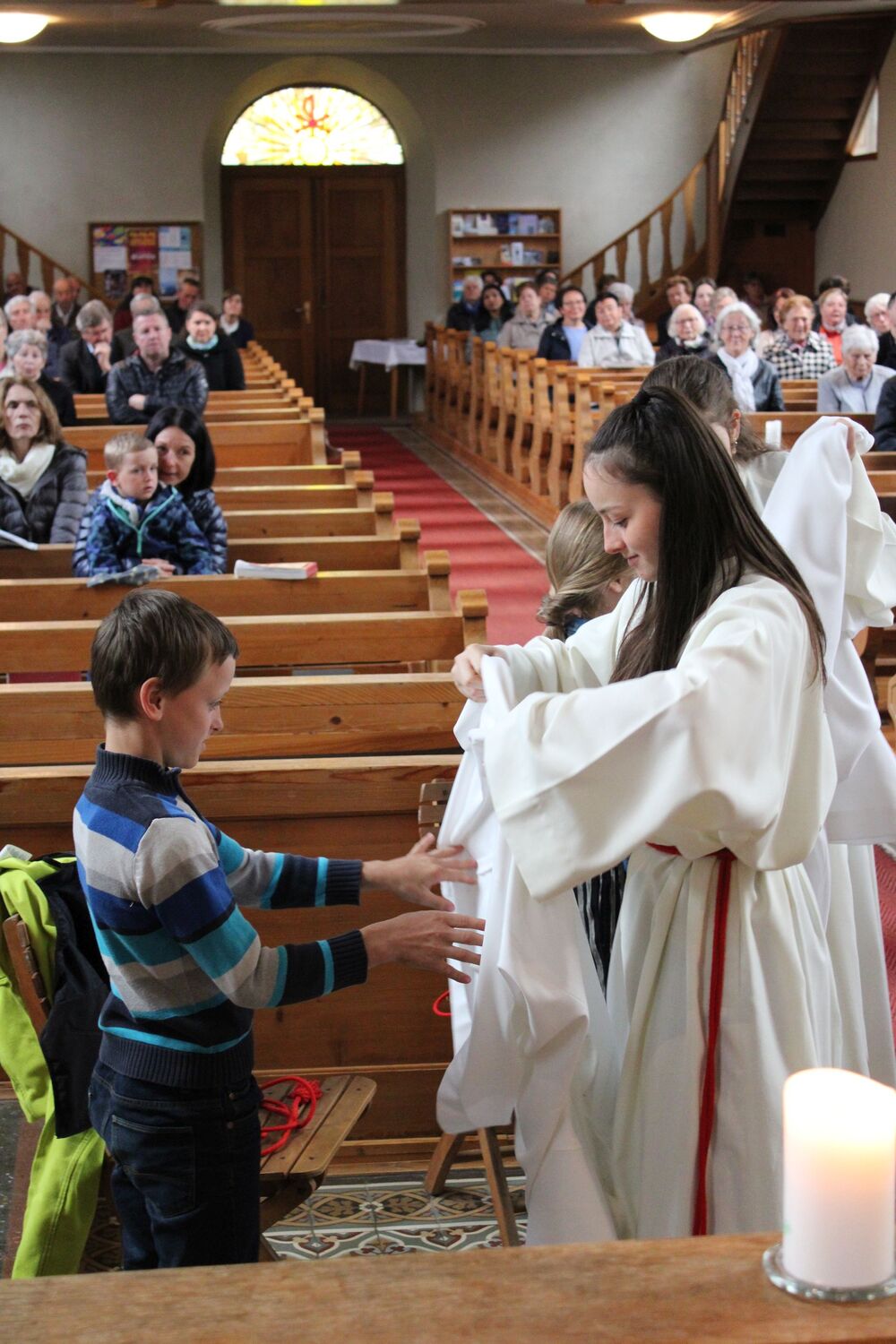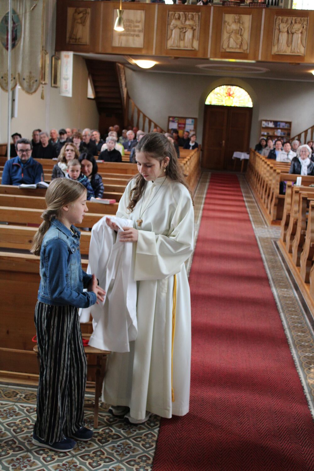 Bevor die neuen Ministranten:innen - Anna Ender, Magdalena Oberhammer, Sara Ambrosig, Theresa Eder und Simon Sinz - ihre Dienste am Altar übernahmen, erklärten sie ihre Bereitschaft. Danach halfen die großen Ministrantinnen beim Anziehen der Ministrantengewänder und Pater Regis segnete die neuen Minis.
