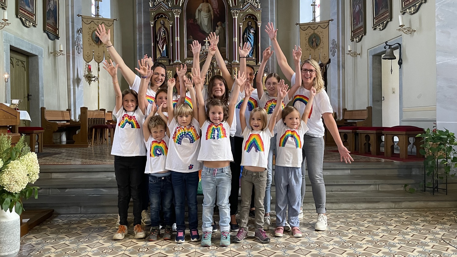 Das Gelernte und Gebastelte konnten die Kinder beim Familiengottesdienst am Sonntag, 8. September in der Thaler Kirche präsentieren. Das Thema des Gottesdienstes war „Das Leben ist bunt wie ein Regenbogen“. Wir alle haben viele bunte Eindrücke während des Sommers gesammelt und sind schon gespannt auf das Bunte und Spannende, das uns mit Kindergarten- und Schulstart erwarten wird. Höhepunkt der Messfeier war der Tanz zum Lied „Wir singen für unseren Gott“. Die Kinder mit ihren Regenbogen- T-Shirts bewegten sich mit Freude und begeisterten damit die Thaler Pfarrgemeinde.