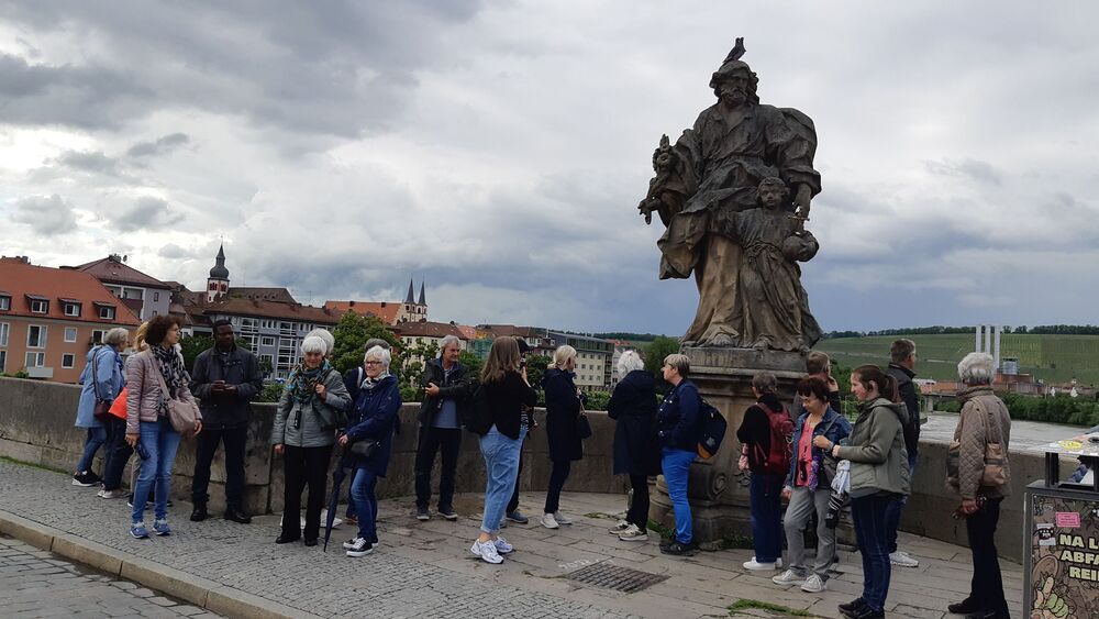 Den Nachmittag verbrachten wir in der Würzburger Innenstadt, wo wir von zwei Stadtführerinnen zu den wichtigsten Sehenswürdigkeiten begleitet wurden. Nach einem ausgiebigen Abendessen nutzten noch einige die Gelegenheit, die Stadt auf eigene Faust zu erkunden. Trotz kurzem Regenschauer ließen wir uns von einem „Brückenschoppen“ – einem Glas Wein auf der Mainbrücke - nicht abhalten.