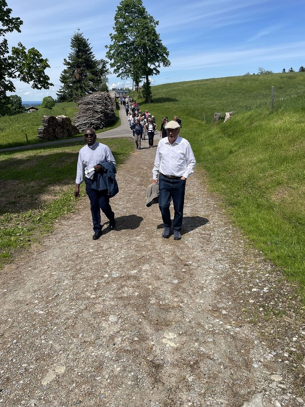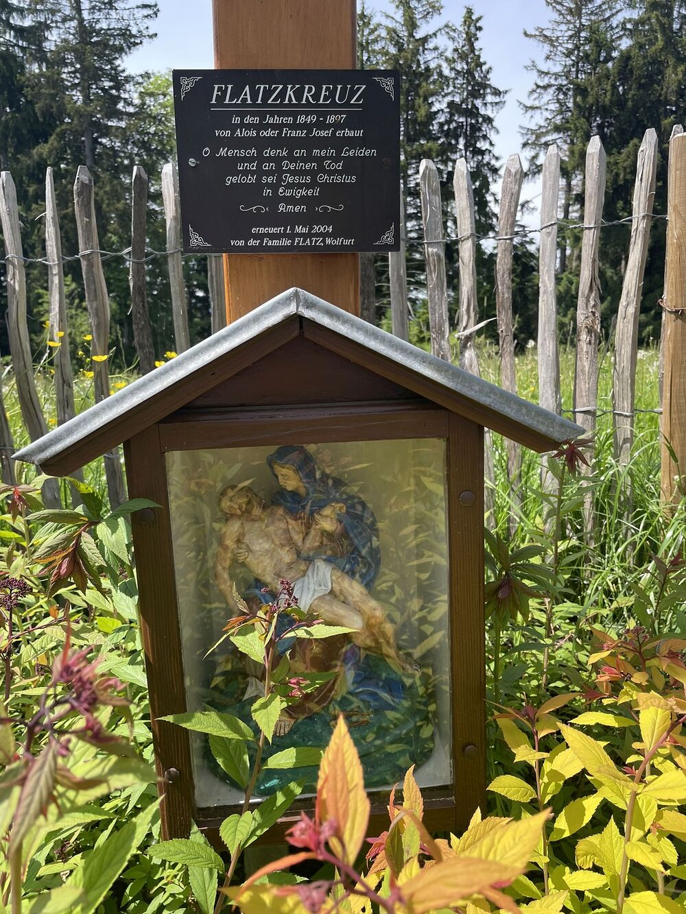 Ausgehend von der Pfarrkirche in Sulzberg führte uns der Weg zur ersten Station bei der St. Antonius Kapelle, wo uns Pfarrmoderator P. Regis Mushunje zunächst den Segen erteilte und wir anschließend Texte zum Hl. Antonius hörten. Wir gingen weiter, beim Moorbad vorbei über einen Feldweg und passierten das „Flatzkreuz“.