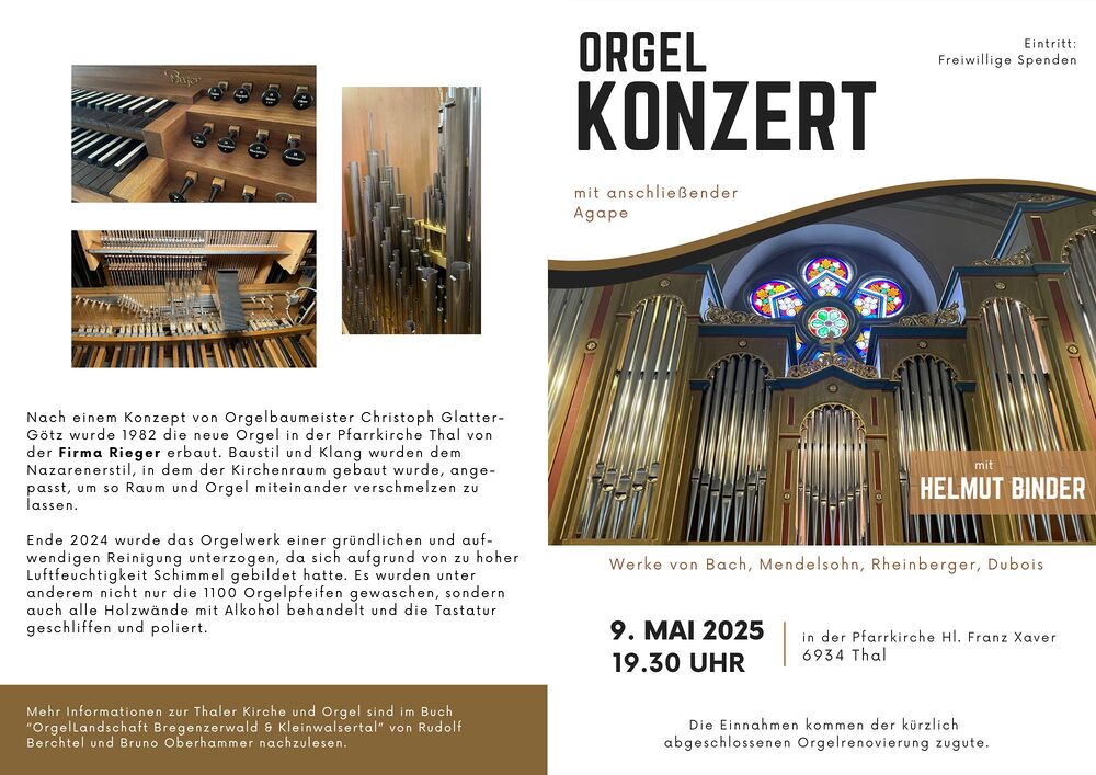 Die Thaler Orgel, erbaut 1982 von der Firma Rieger, wurde Ende 2024 aufwendig gereinigt, nachdem sich aufgrund von Feuchtigkeit Schimmel gebildet hatte. Alle 1100 Orgelpfeifen und Holzwände wurden behandelt sowie die Tastatur geschliffen und poliert.