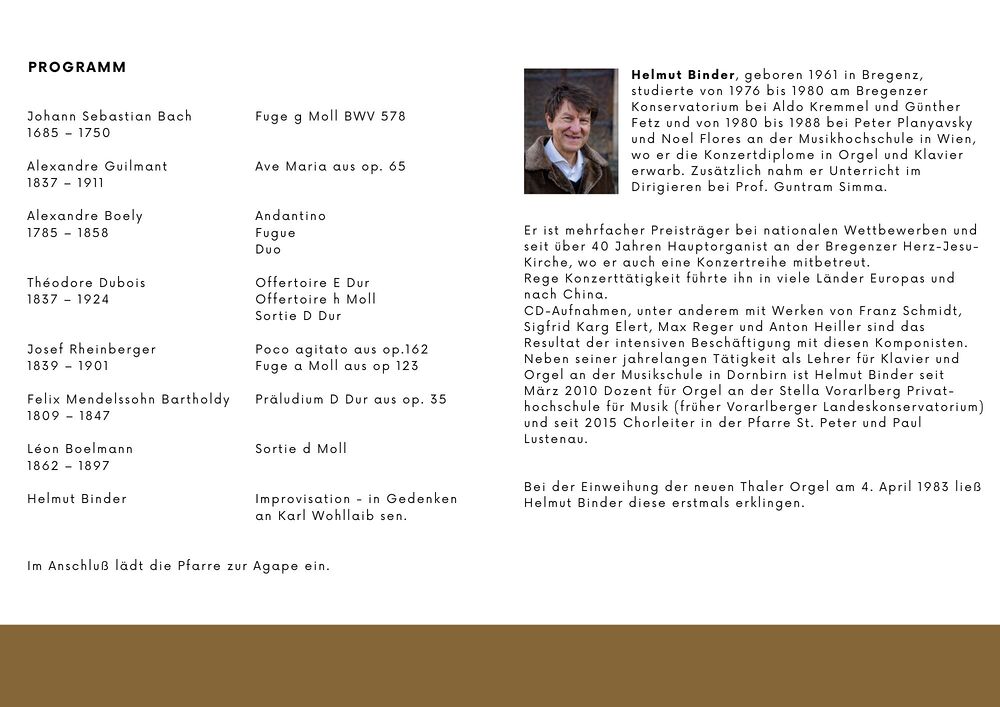 Helmut Binder ist ein vielfach ausgezeichneter Konzertorganist und seit über 40 Jahren Hauptorganist in Bregenz. Er unterrichtet Klavier und Orgel in Dornbirn und ist zudem Dozent für Orgel an der Stella Vorarlberg Privathochschule für Musik.